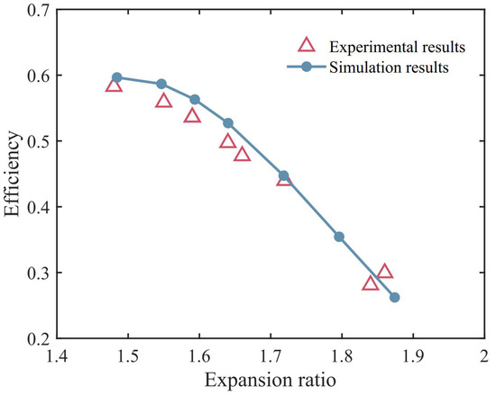 The numerical method employed in this study was validated against a previous experimental investigation [42]. A simulation was conducted on the same partial admission turbine used in that experimental study, employing the same numerical approach described earlier. Figure 4 compares the simulated turbine efficiency, calculated using Equation (1), with the experimental data across a range of expansion ratios. Overall, good agreement is observed, with the predicted efficiency trends closely matching the experimental data. The maximum absolute deviation in efficiency is approximately three percentage points. This discrepancy may be attributed to several factors. First, for small-scale turbines, manufacturing tolerances and surface roughness may have a noticeable impact on performance. Second, during actual operation, the turbine generator system incurs additional losses such as windage losses, which are not accounted for in the CFD simulations using ANSYS CFX 2021 R1. Therefore, considering the close agreement in trends and the inherent differences between the modeled and measured efficiencies, the numerical method adopted in this study is deemed reliable for analyzing the aerodynamic performance of partial admission S-CO2 turbines.