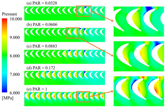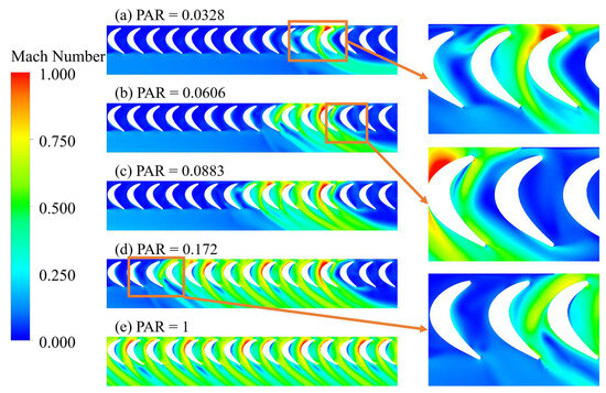 An analysis of the flow field in the rotor domain was conducted. Figure 7 shows the Mach number distribution at the 50% blade height position under different partial admission ratios. Under full admission conditions, the flow through different blade passages is generally the same, with only slight differences arising from the application of the frozen rotor model. Under partial admission conditions, in the blade passage at the far right of the active sector, a mixture of high-momentum fluid leaving the nozzle and stagnation fluid can be observed. In the blade passage at the far left of the active sector, the high-momentum fluid entering the passage starts to decrease, leading to local stagnation. The fluid entering this passage first attaches to the suction side of the rotor blade and then moves to the pressure side of the next blade before exiting the passage. At the smallest partial admission ratio, only one blade passage exhibits a complete flow. Figure 8 shows the static pressure distribution at the 50% blade height under different partial admission ratios. For turbines with larger partial admission ratios, the flow in the active sector is similar to that under full admission. However, under smaller partial admission ratios, the pressure difference between the pressure and suction surfaces of the rotor blades is smaller, resulting in a reduction in the forces on the blades.