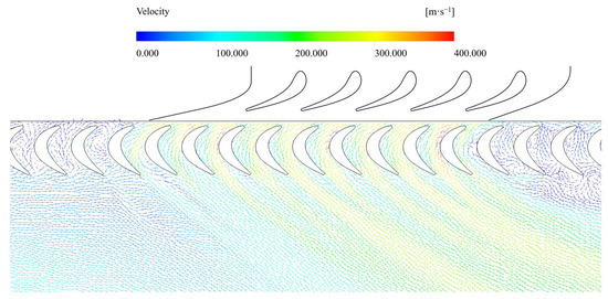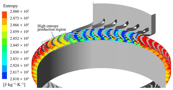The velocity vector distribution at 50% blade height is shown in Figure 9, using a partial admission ratio of 0.172 as an example. It can be observed that the flow condition in the middle of the active sector is favorable. When the blade passage enters the admission arc, the stagnation fluid is pushed by the high-momentum fluid, forming a vortex structure in the middle of the passage. As the blade passage nears the exit of the admission arc, the flow rate within the passage begins to decrease. The fluid fills the entire passage in the first half of the passage along the flow direction, after which the flow starts to shift towards the pressure surface of the next blade in the rotational direction, causing flow separation on the suction surface. Figure 10 shows the entropy distribution at different axial positions. In the admission arc, regions of higher entropy indicate the location of vortex. The tip passage vortex and tip leakage vortex can be observed at the upper part of the passage, while the hub passage vortex can be seen at the lower part. As the blade passage nears the exit of the admission arc, a large high-entropy region is observed throughout the passage, suggesting the presence of large-scale vortex. In several blade passages leaving the admission arc, significant entropy production is observed, indicating that substantial flow losses occur in this region.