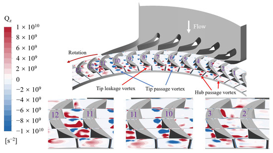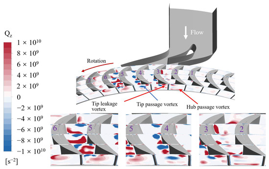 An analysis of the vortex structure within the rotor blade passage is performed. The Q-Criterion, which represents the second invariant of the velocity gradient, is a method for identifying the vortex [47]. The expression for the Q-Criterion is shown in Equation (5):
