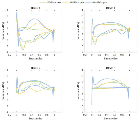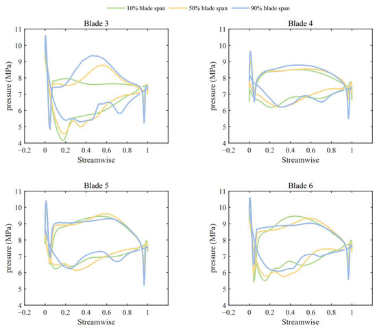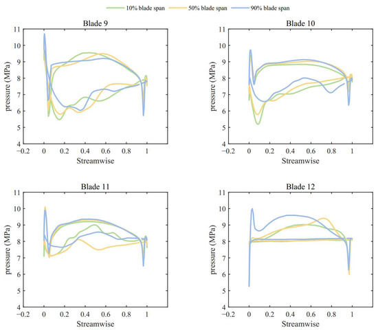 Based on the analysis in the previous subsection, for a partial admission ratio of 0.172, the interaction between the flow within blade passages near the entrance of the active sector and the flow within passages near the exit of the active sector can be largely neglected. Figure 11 presents a schematic of vortex structures for the case with a partial admission ratio of 0.172, viewed from the rotor outlet. The rotor blades are numbered in the figure for reference in the following discussion. According to the definition of Qz introduced earlier, red regions indicate counterclockwise vortices, while blue regions represent clockwise vortices. In the central part of the active sector (between blades 3 and 10), a counterclockwise tip leakage vortex can be observed in the upper part of the rotor passage, along with a clockwise tip passage vortex. In the lower part of these passages, a counterclockwise hub passage vortex is present. The passages at the boundary between the active and inactive sectors are magnified for detailed analysis. Figure 12 and Figure 13 show the blade loading distributions at various spanwise positions for rotor blades entering and exiting the admission sector.