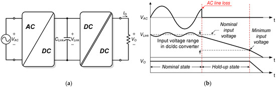 To meet these application-specific hold-up time requirements, power converters must not only ensure reliable energy delivery during interruptions but also address size and cost constraints. During the hold-up time, i.e., when the AC line is momentarily lost, the energy required by the load is supplied by the DC/DC converter, which draws power from the bulky link capacitor. Therefore, the converter must be carefully sized to satisfy the requirements typically ranging from 10 ms to over 50 ms, depending on the relevant standards [1,2,3].