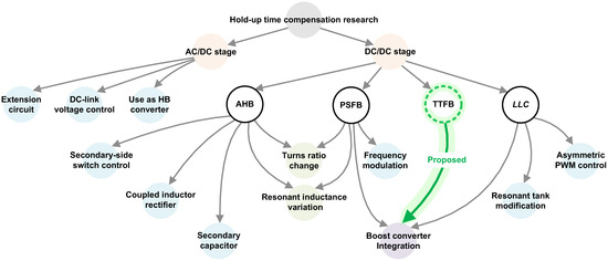 To solve these problems, researchers have proposed various hold-up time compensation techniques, as illustrated in Figure 2. The first approach involves improving AC/DC control strategies [7,8,9,10]. A method to compensate for the link capacitor voltage using an extension circuit was studied in [7,8]. However, the additional power diode in the main current path decreases the converter’s efficiency. A variable DC-link voltage control scheme is discussed in [9], and the use of a boost converter as a half-bridge converter is studied in [10]. However, placing a capacitor between the bridge diode and the AC/DC stage may lead to undesirable harmonic distortion.