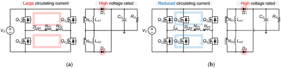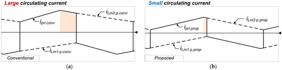 Figure 10 shows the circulating current of the conventional and proposed converters. The circulating current of the proposed converter is lower than that of the conventional one. This results from the higher duty ratio of the primary-side switches. As a result, the freewheeling period is shortened, thereby further reducing the circulating current. The magnitude of the circulating current directly influences the primary-side RMS current. As the primary-side RMS current decreases, the corresponding power loss is also reduced.