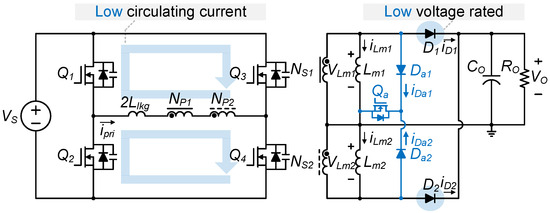 - Jeong, S.-W.; Lee, S.-H.; Kwon, D.-H.; Kim, J.-Y.; Kim, J.-K. Two-transformer phase-shift full-bridge converter with a new rectifier for reducing conduction loss. IEEE Trans. Power Electron. 2023, 38, 15634–15644. [Google Scholar] [CrossRef]