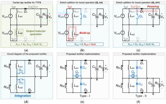 Derivation of the proposed rectifier: (a) center-tap rectifier, (b) on-state switch added rectifier, (c) off-state switch added rectifier, (d) concept of the proposed rectifier, (e) type I rectifier, (f) type II rectifier.