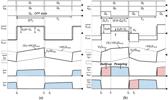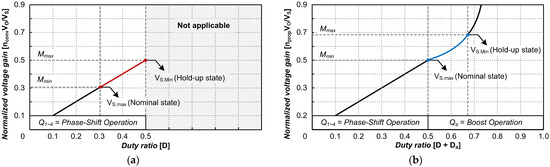 The voltage applied to Lm2 in the hold-up state is shown in Figure 6b. During the first half-cycle, the applied voltage is VS/n for Da·TS and (VS/n − Vo) for (0.5 − Da)TS. During the second half-cycle, the applied voltage is 0 for Da·TS and −Vo for (0.5 − Da)Ts. Therefore, the normalized voltage gain in the hold-up state Mhold can be expressed as follows: