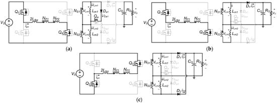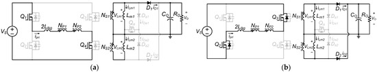 The normalized voltage gain of the proposed converter can be obtained by applying the volt-second balance to the magnetizing inductor. As shown in Figure 6a, the voltage applied to Lm2 in the nominal state is identical to that in the conventional TTFB converter. Consequently, the normalized voltage gain in the nominal state Mnom can be expressed as follows:
