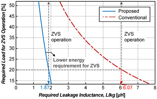 From (15) and (16), it is evident that the ZVS condition of the proposed converter is primarily determined by the leakage inductance and the load condition. Figure 11 illustrates the relationship between load and leakage inductance, assuming a constant duty ratio across the full load range. At 20% load, the leakage inductance required to achieve ZVS in the conventional converter is approximately 3.2 times that of the proposed converter. This indicates that the proposed converter requires less energy to achieve ZVS.