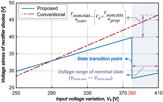 Figure 12 illustrates the voltage stress on the rectifier diodes of both the conventional and proposed converters. In the conventional converter, the voltage applied across rectifier diodes D1 and D2 is always VS/nconv in both the nominal and hold-up states, respectively.