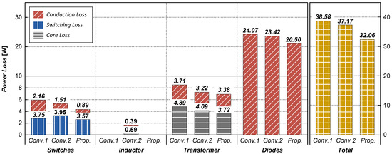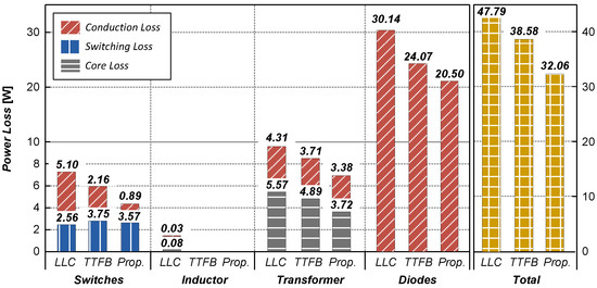 Figure 13 shows the power loss distribution of the LLC, TTFB, and proposed converters under nominal input voltage and full-load conditions. The LLC shows the highest loss of 47.79 W, mainly due to high diode losses. The TTFB reduces losses to 38.58 W with lower transformer and diodes losses. The proposed converter achieves the lowest total loss of 32.06 W by minimizing switch and diodes losses, demonstrating superior efficiency.