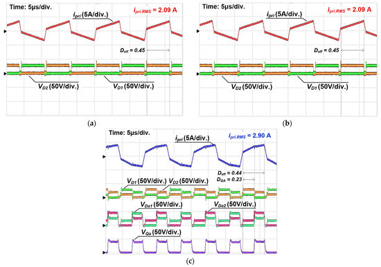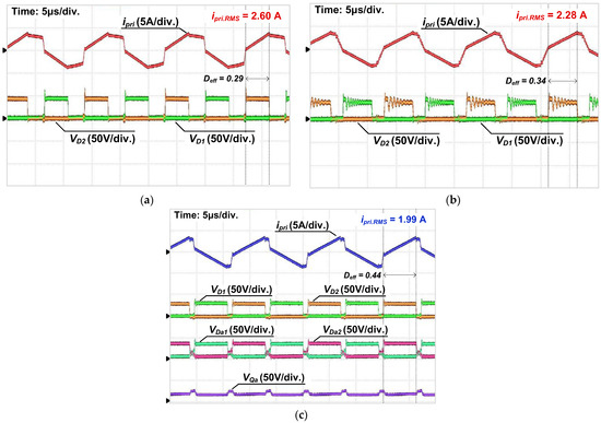 Waveforms of the prototype converter at a 400 V input voltage: (a) conventional 1 [25], (b) conventional 2 [18], (c) proposed.