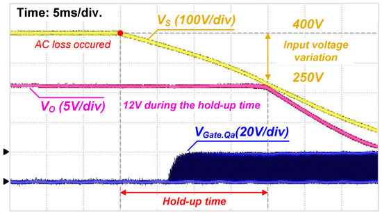 Figure 16 presents the waveforms of the transient operation during the hold-up time. When AC loss occurs, the input voltage VS begins to drop gradually. As the input continues to fall, the duty D increases and eventually reaches 0.5. After this point, the auxiliary switch Qa is turned on to maintain a stable output voltage. Consequently, the output voltage is tightly regulated during the hold-up time.