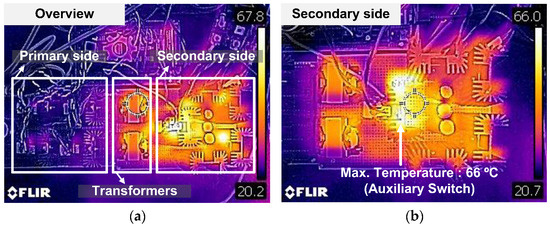 Thermal image of the proposed converter under full-load condition (VS = 250 V): (a) overview, (b) secondary side view.