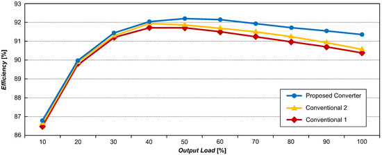 Figure 19 shows the measured efficiency curves under nominal input condition. Although the proposed converter includes an additional MOSFET and two auxiliary diodes, these components do not conduct during the nominal state and, therefore, do not contribute to additional losses. Consequently, the proposed converter achieves higher efficiency than both conventional converters across the entire load range.