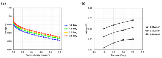 Figure 3a presents the polarization curves obtained at pressures of 1.0, 1.5, 2.0, and 2.5 bara. As expected, higher pressure enhanced the overall performance, particularly in the low current density region, through increased thermodynamic potential and reaction kinetics. However, beyond 0.4 A/cm2, the IV curves converged to nearly parallel slopes, suggesting that the primary effect of pressure was limited to activation polarization. The diminishing performance gain at higher pressures (e.g., from 2.0 to 2.5 bara) suggests a saturation effect (Figure 3b). Although increased pressure enhances performance, the benefit decreases at higher levels, highlighting the need to optimize operating pressure by balancing performance gains against membrane durability and system stability. Excessive pressure may accelerate membrane degradation and compromise reliability [19]; thus, appropriate depressurization and membrane thickness selection are essential for stable AIP operation.