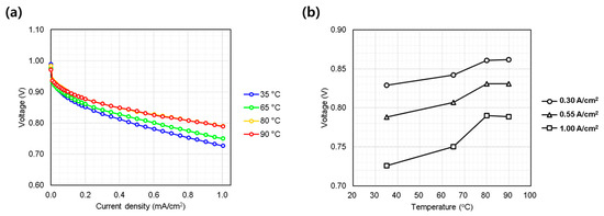Single cell performance evaluation under varying cell coolant temperature (35~90 °C at inlet port). (a) IV curves measured from 0.0 to 1.0 A/cm2; (b) voltage behavior at representative current densities: low (0.30 A/cm2), medium (0.55 A/cm2), and high (1.00 A/cm2).
