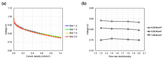 The stoichiometric flow ratio varied from the reference condition of 1.3 to 1.5, 1.8, and 2.0 to investigate the effect of reactant flow rate on cell performance. As observed in Figure 6a,b, the single cell performance showed minimal sensitivity to variations in flow rate. Typically, the performance of conventional fuel cells becomes sensitive to variations in flow rate primarily at high current densities, where mass transport limitations become more pronounced [2,21,22], or under conditions where excessive flooding occurs [23]. However, in this study, evaluations were conducted only at current densities below 1.0 A/cm2. Furthermore, since the oxidant was high-purity oxygen rather than air containing only 21% oxygen, the oxygen diffusion characteristics within the GDL and catalyst layers were expected to remain sufficiently high, independent of flow rate variations.