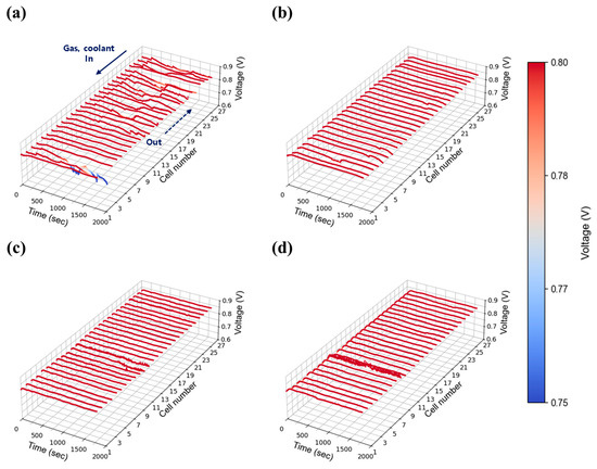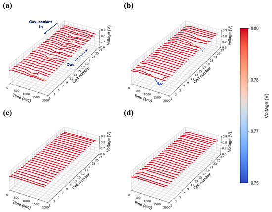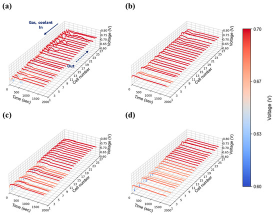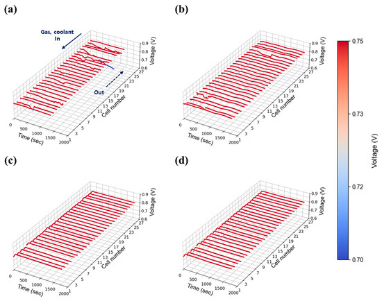A high current density of 1.00 A/cm2 was evaluated to reflect the operational characteristics of AIP systems, which prioritize high-efficiency operation at elevated voltages. As shown in Figure 11a, severe voltage fluctuations were observed at stoichiometry 1.3 under 30% relative humidity, indicating that water generated at this current density could not be adequately removed at the lowest flow setting. As stoichiometry increased to 1.5 (Figure 11b), voltage instability was reduced but not fully eliminated, whereas stable operation was achieved at flow rates of 2.0 and above as shown in Figure 11c,d. At 50% relative humidity, voltage instability was significantly exacerbated compared to the 30% case. Unlike at lower humidity, where instability was confined to specific cells, the higher humidity condition induced widespread voltage fluctuations across nearly all cells as shown in Figure 12a. The impact of water generation became more pronounced at higher current density, and the propagation of instability throughout the in-plane regions became evident. Notably, even a stoichiometry of 2.0 (Figure 12c), which previously provided stable operation, exhibited instability at 50% humidity, suggesting that higher humidity increases the minimum flow rate required to maintain stability. This issue was resolved at a stoichiometry of 2.0, where stable voltage profiles were restored as shown in Figure 12d.