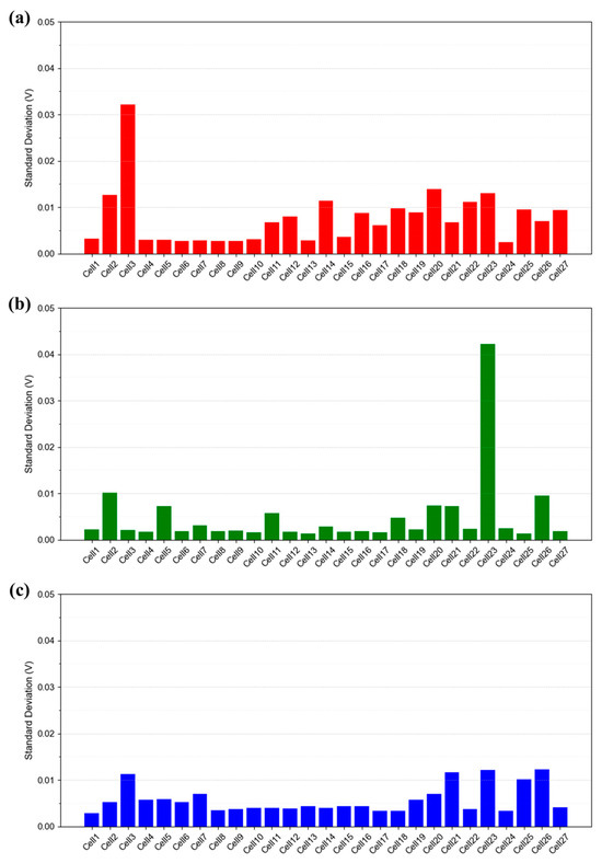 Time-resolved standard deviation of each cell (27 total) in the 1 kW stack measured under the IV1 condition described in Table 1. Current density: (a) 0.30 A/cm2, (b) 0.50 A/cm2, and (c) 1.00 A/cm2.