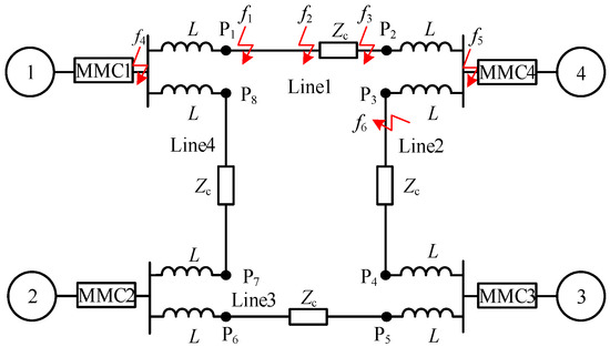 Taking a four-terminal ring flexible DC grid as an example, all four converter stations adopt a symmetrical bipolar MMC configuration, and current-limiting reactors are installed at both ends of every DC transmission line. This study takes the Zhangbei ±500 kV true-bipolar MMC four-terminal flexible DC demonstration project as its prototype, which helps to ensure the engineering verifiability of the protection-algorithm evaluation. The topology is illustrated in Figure 1 [28], where Line 1–Line 4 denote the DC overhead transmission lines and P1–P8 indicate the measurement points at both line terminals; the various fault locations are marked in the figure. Using P1 as an example, (f1, f2, f3) correspond to forward-direction internal faults at the sending end, midpoint, and receiving end, respectively; f4 represents a reverse external fault; and (f5, f6) correspond to forward external faults.