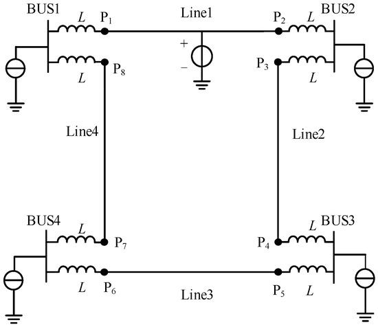 Because the surge impedance of a transmission line is independent of its length, and identical conductors are generally used within the same DC grid, Lines 1 and 4 share the same surge impedance. Likewise, the current-limiting reactors at the sending ends have identical inductances. Hence, the currents in Lines 1 and 4 are equal, as expressed in Equation (3).