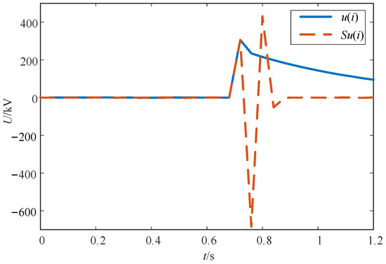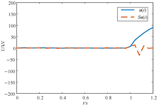 Figure 5 shows the variation in the line-mode voltage fault component across the current-limiting reactor during an internal fault, along with the corresponding signal after the SOD transform. Under an internal fault, the initial traveling wave generated at the fault point propagates along the line to the reactor, and the line-mode voltage rises rapidly. After the SOD transform, the signal varies more sharply and its peak value increases, meaning that the internal-fault characteristics are magnified.