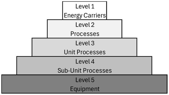 Hierarchical levels in this study were split by conditions such as the degree of complexity, the objective of energy flow, etc. By deploying the principles by McCarthy (1995) [40] and then transforming these into an energy use context, using energy flow as a core attribute, in [47], a hierarchical taxonomy structure was developed (Figure 1).