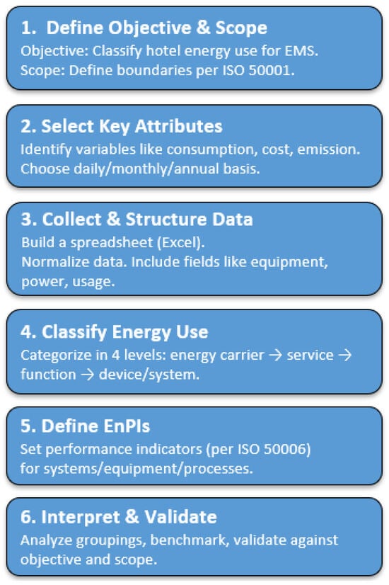 When applying the taxonomic method to energy analysis in hotels, some requirements must be followed, e.g., define the objective and scope of the analysis; identify and select the attributes or variables that characterize the energy behavior of objects or entities, such as final energy use, demand, production, intensity, emission, performance, and cost. This can then be followed by the establishment of a database where classification or grouping methods interpret and validate the results.