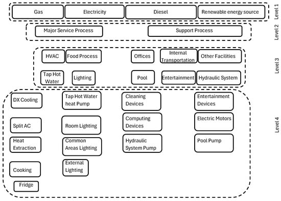 In Figure 3, the categorization by levels represented is generic for hotels of all categories, locations, and type of construction. The developed methodology was then applied to a typical five-star hotel, located in an urban area in Cuba; its design was in the form of a single main building. The hotel does not have a pool. It has a total of 56 rooms, a restaurant, a lobby bar, and a snack bar. In addition, the facility has two kitchens, staff offices, and other common areas in the hotel facilities. The hotel selection is based on the results of previous studies [39,56] that support the typicality of energy processes and equipment in this context. In the following section, the proposed methodology is applied to this five-star hotel.