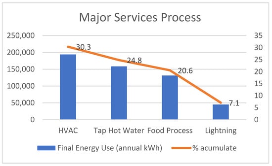 At this level, it can be seen that the main services represent 89% of the hotel’s total final energy use as shown in Table 3. Previous studies noted that 70% of the total energy use is utilized for production in the food industry, which shows that the major processes are more intensive for the food sector and the remaining 30% of the energy is used by the support processes [45].