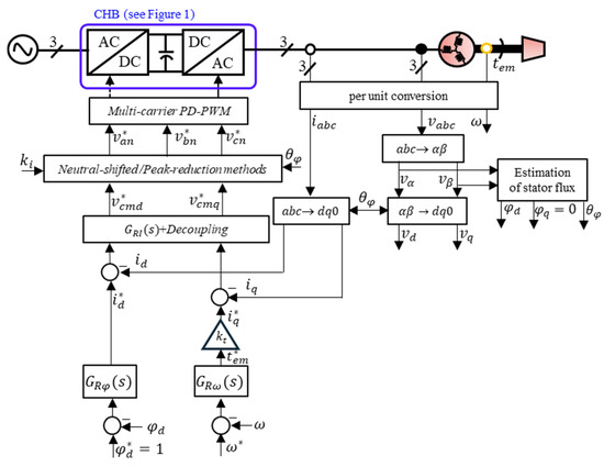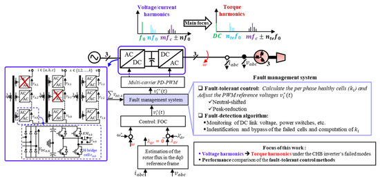 As commercialized in [2], the investigated system shown in Figure 1 is based on a CHB inverter operating with fault-tolerant control techniques (FTCTs) [5]. The phase disposition (PD) PWM is adopted as it provides the best voltage harmonic performances among the multi carrier PWMs [6,7,8]. Also, field-oriented control (FOC) is adopted due to its fast dynamic response and acceptance in the industry [2].