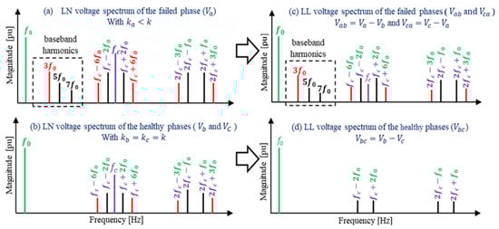 They appear only the LN voltage spectrum of the failed phases. In the LL voltage and current spectra, they are in the form of positive (), negative (), and zero-sequence () harmonics, as given in Equations (4a)–(4c), respectively: