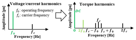 Since the term “” is in the denominator of Equation (14) and for any PWM inverter, the relation is verified, and the torque harmonics have larger magnitudes when [30].