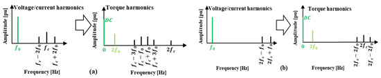 The interaction between the stator’s flux and current during the abnormal modes produces a motor torque having two components localized at the frequencies and given, respectively, in Equations (14c) and (14d):