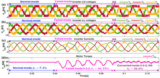 Figure 16d shows the motor torque spectra during the failed (3-3-2, pink lines) and corrected (3-3-2, green lines) modes using the Neutral-shifted method. During the corrected mode, the torque harmonics appear at the same frequencies as those found during the failed mode and given in Equation (25) because the frequencies of the voltage harmonics are unaltered by the Neutral-shifted method.