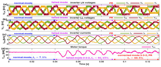 Figure 15d shows the torque spectra during the normal (blue dashed lines) and failed (3-3-2, purple solid lines) modes. The extra torque components are created by the zero-sequence harmonics found in the LL voltage and current spectra during the failed mode. Also, the relevant torque’s harmonics appear as follows: