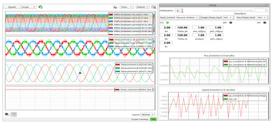 During normal mode [30], the DC component of the torque is created by the interaction between the voltage and current harmonics localized at the same frequencies. To assess the effects of abnormal modes on the motor torque spectrum, let us set and ; as a result, Equation (14) becomes Equation (15):