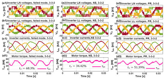 During the corrected mode 3-3-2 shown in Figure 21(a1–c1), both approaches produce a voltage with almost the same THD. This result is consistent with Figure 16 and Figure 17. But the NS produces the lowest current THD around the rated frequency (60–50 Hz) because the () harmonic in the current spectrum has a lower magnitude compared to that generated by the PR. However, the PR produces the lowest current THD at lower operating frequencies (35–45 Hz) because the magnitude of the harmonic (, due to the homopolar component) decreases within 35–45 Hz. As a result, the PR induces also the lowest torque ripple within 35–50 Hz because the relevant torque component () has a lower magnitude when using the PR compared to the NS for this specific abnormal mode (3-3-2).