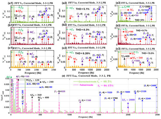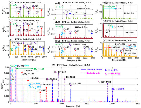 Moreover, in Figure 15(a3–c3), the carrier and appear with high magnitudes only in the current spectrum of the failed phase because they are uncancelled in . Thus, the THD of is higher than those of and . These zero-sequence harmonics will be converted into the motor torque components.