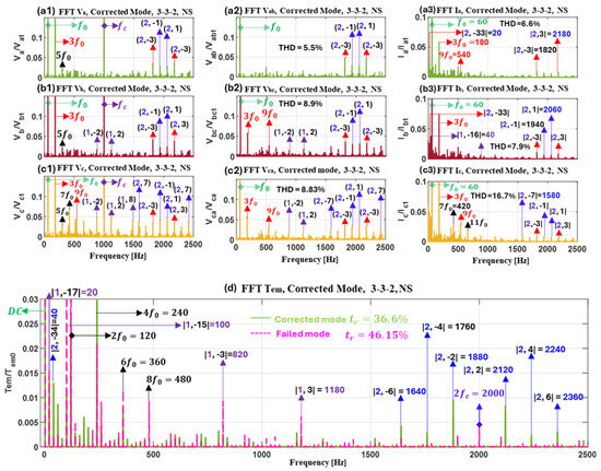 Figure 16 shows the spectral characteristics of the CHB inverter and the motor torque during the corrected mode (3-3-2) using the Neutral-shifted method. Since the frequencies of the voltage harmonics are unaffected by the Neutral-shifted method, the LN voltage harmonics of the healthy and failed phases shown in Figure 16(a1–a3) appear at the same frequency but with unequal magnitudes. In contrast to the failed mode (Figure 15), the baseband harmonics, such as and , also appear in the voltage spectra ( and ) of the healthy phases due to the homopolar component injected into the reference voltages.