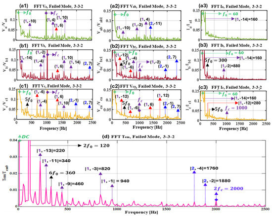 During the failed mode (3-3-2), the baseband harmonics such as () appear only the spectrum of the failed phase (), as shown in Figure 18(a1–c1). Moreover, in Figure 18(a2–c2), the carrier () and triplen (, etc.) harmonics are unsuppressed in the LL voltage spectra of the healthy and failed phases ( and ). Also, in the current spectrum () of the failed phase shown in Figure 18(a3–c3), the carrier () and the triplen () harmonics are uncancelled. These results are consistent with the theoretical analyses provided in Section 2 and confirm the accuracy of the expressions of voltage harmonics given in Equations (3)–(8).