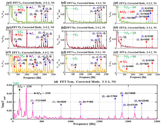 Frequency domain virtual HIL simulation results during the corrected mode 3-3-2 using the Neutral-shifted method: (a1–c1) LN voltages, (a2–c2) LL voltages, (a3–c3) currents, and (d) motor torque with , .