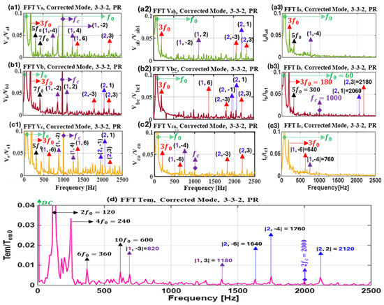 Frequency domain virtual HIL simulation results during the corrected mode 3-3-2 using the Peak-reduction method: (a1–c1) LN voltages, (a2–c2) LL voltages, (a3–c3) currents, and (d) motor torque with , .