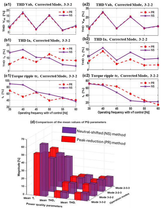 Performance comparison of the Neutral-shifted (NS) and Peak-reduction (PR) methods: (a1–c1) corrected mode 2-3-3, (a2–c2) corrected mode 3-2-2, and (d) mean values of the power quality parameters with and .