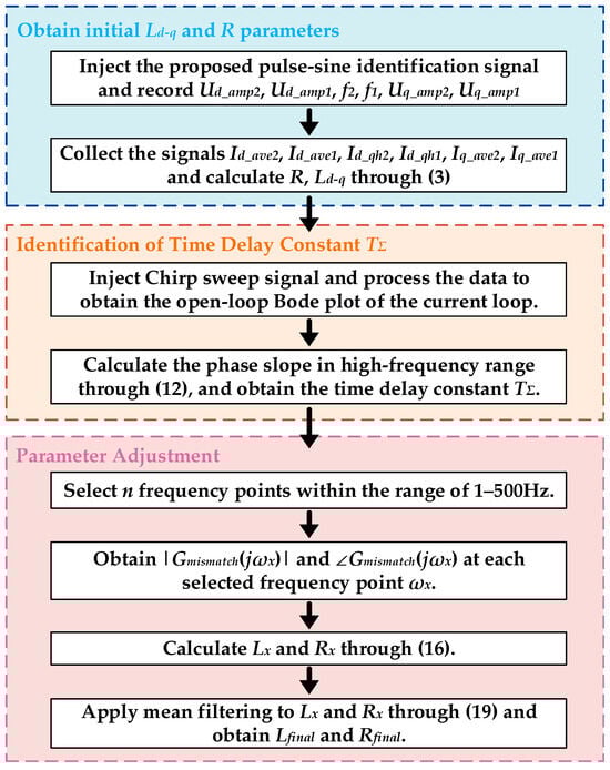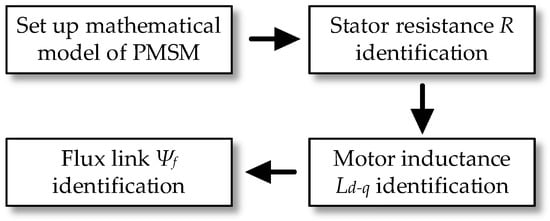Under the condition that the voltage equation exhibits a rank of two while four parameters are to be identified, a rank deficiency problem naturally arises. Consequently, it is necessary to carefully determine the sequence of parameter identification to ensure reliable estimation. In the context of current loop PI controller tuning, the resistance and inductance values are of primary importance, whereas the flux linkage is typically treated as the final parameter to be identified. Notably, the stator resistance appears exclusively in the d-axis voltage equation, and due to its relatively simpler estimation process compared to that of inductance, it is selected as the initial target for identification. The overall identification sequence of the motor parameters is illustrated in Figure 1.