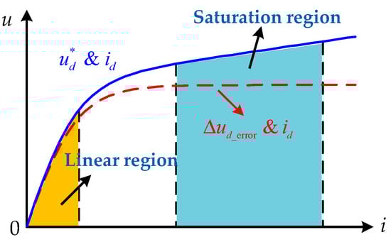 where Δud_error and Δuq_error are the inverter’s nonlinear error voltages of d-q axis. The inverter’s nonlinear error voltage is attributed to various nonlinear factors of power devices, including but not limited to dead-time, turn-on/turn-off delay of switching tube, and parasitic capacitance. The nonlinear error voltage characteristics are shown in Figure 2 (take Δud_error as an example).