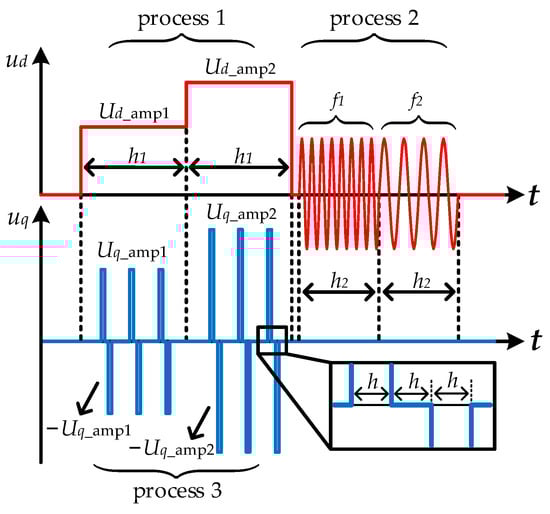 Process 1—Stator resistance (R) identification: Two distinct DC voltage commands, Ud_amp1 and Ud_amp2, are applied sequentially over a fixed duration h1. During this period, multiple excitations are performed to obtain corresponding d-axis voltage measurements. By subtracting these measured voltages, the influence of the inverter’s nonlinear voltage error term, Δud_error, is effectively reduced. Following this compensation, the stator resistance R is estimated accurately using the relationship defined in Equation (3). This approach helps enhance the robustness of resistance identification by mitigating inverter-induced distortions.