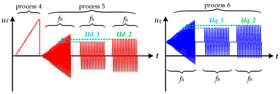 Process 5—d-axis inductance (Ld) identification: The procedure begins with the definition of two current threshold values. Sinusoidal voltages with gradually increasing amplitudes are then injected into the d-axis. When the feedback current reaches each predefined threshold, the corresponding voltage amplitudes, Ud_1 and Ud_2, are recorded. Subsequently, sinusoidal voltages with amplitudes Ud_1 and Ud_2 are applied, and the resulting high-frequency current responses, Idh1 and Idh2, are extracted using the discrete Fourier transform. The frequency of the injected signal is set to fh = 1 kHz. Finally, the d-axis inductance Ld is calculated using Equation (4).