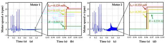 For Motor 2, Ud_amp1 and Ud_amp2 in Process 1 are 1.2 V and 1.8 V, respectively, while h1 is 0.2 s; f1 and f2 in Process 2 are 200 Hz and 100 Hz, respectively, while h2 is 0.23 s; Uq_amp1 and Uq_amp1 in Process 3 are 8.0 V and 9.6 V, respectively, while h is 2 × 10−4 s. Figure 6b presents the feedback current waveform of Motor 2. The corresponding motor speed waveform and identification results are shown in Figure 7. The identification results and errors of each parameter of the motors are shown in the Table 2.